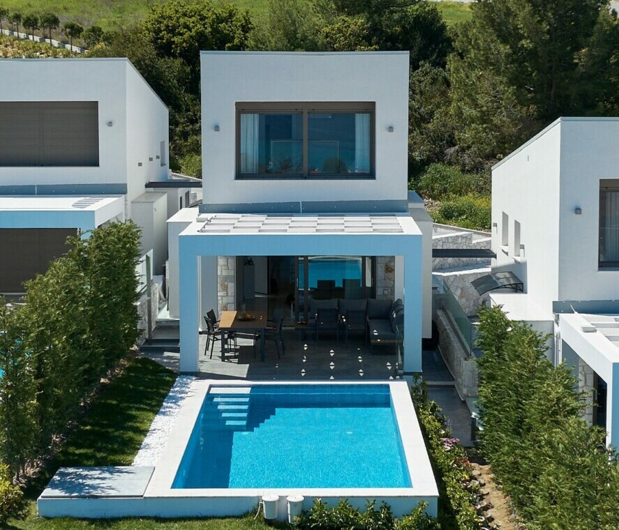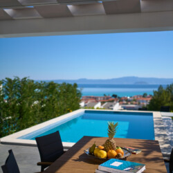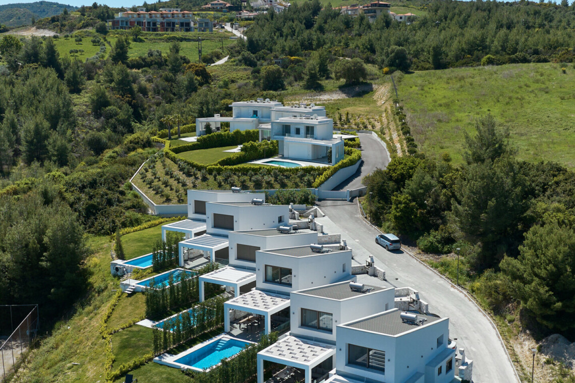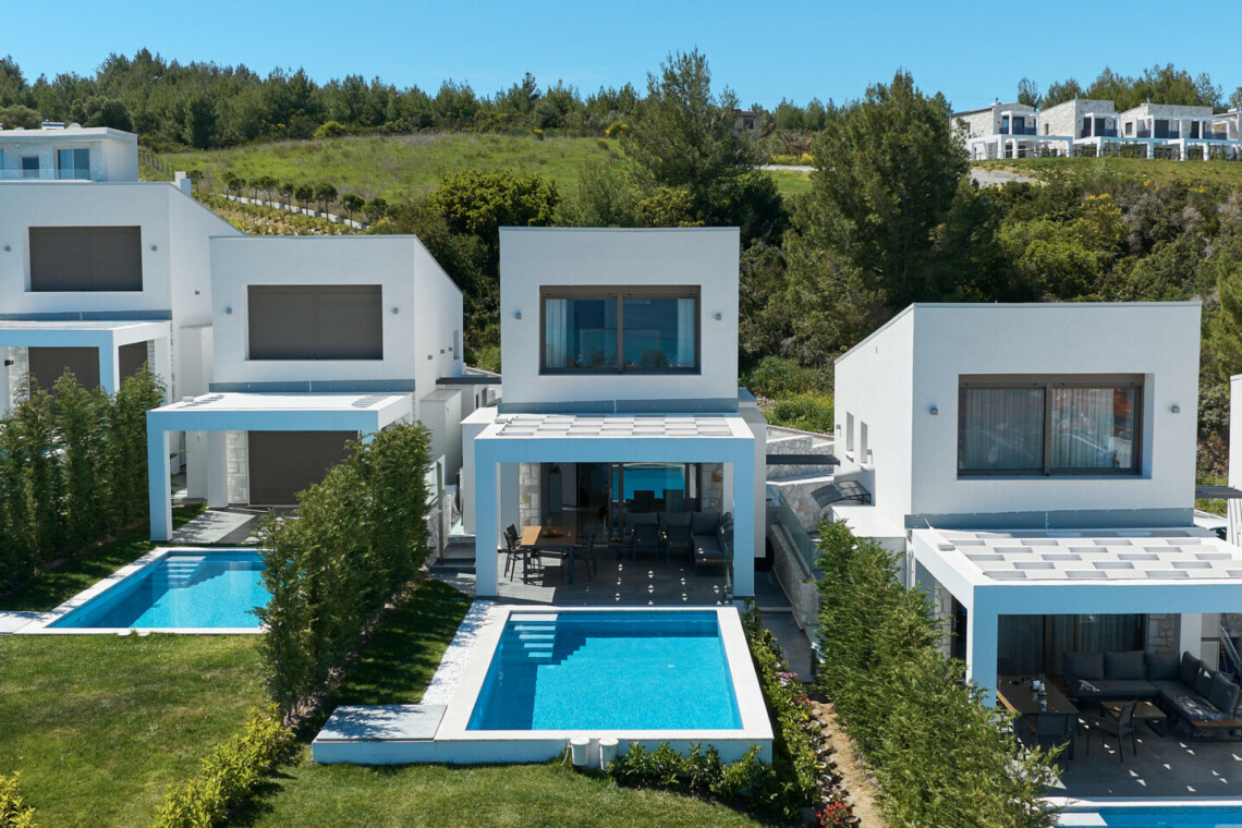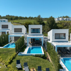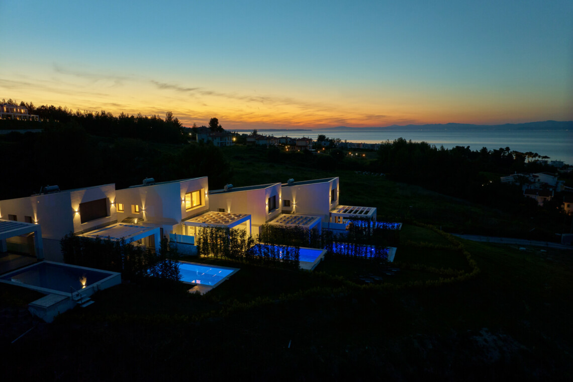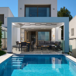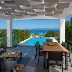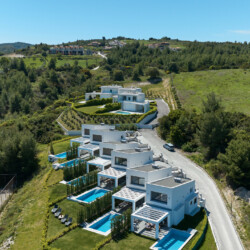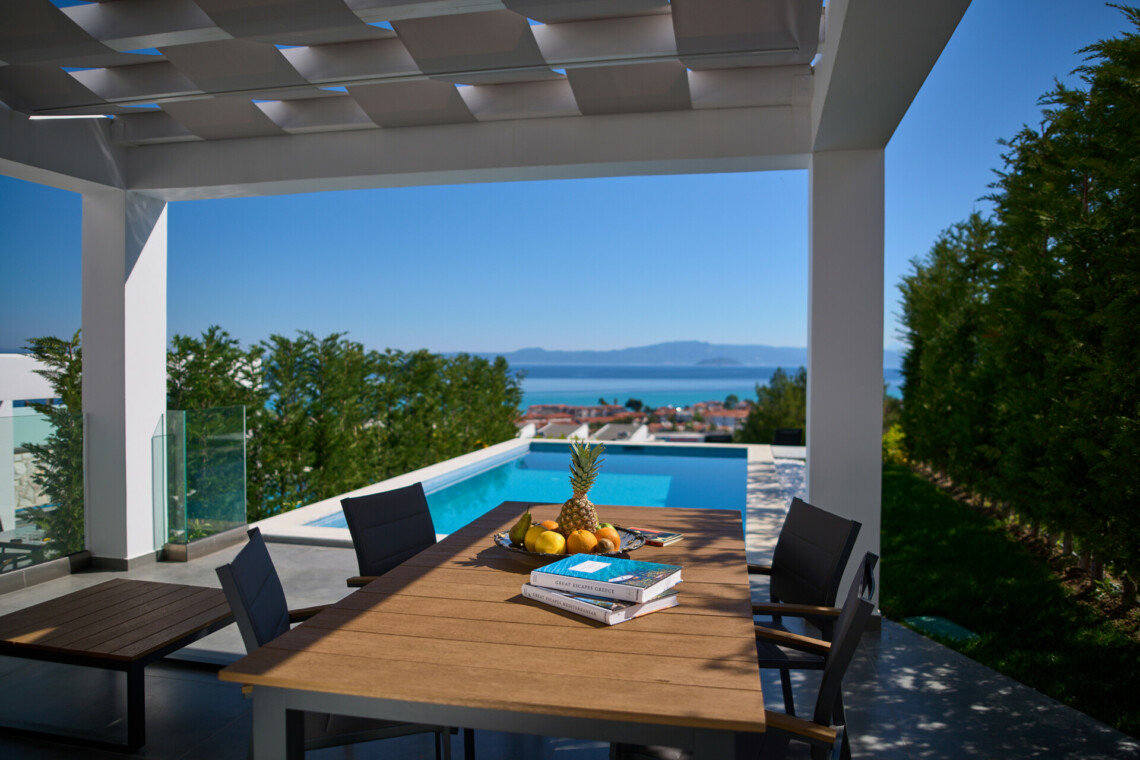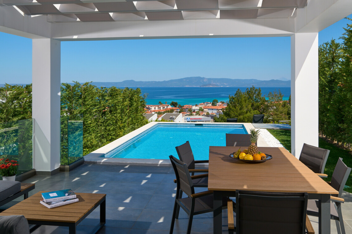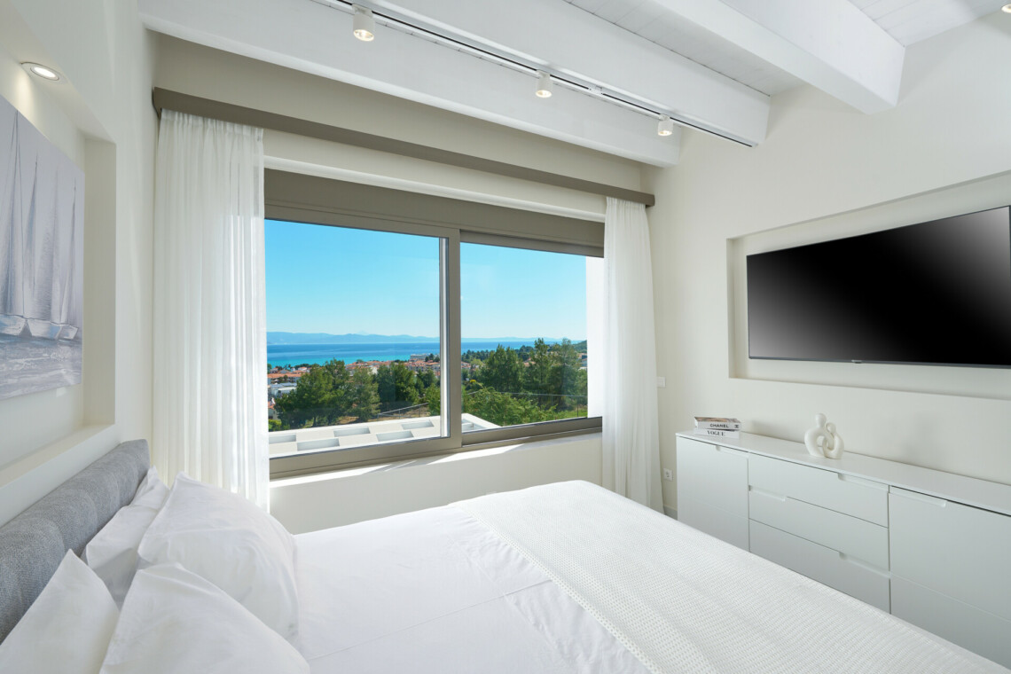 New Luxury Villa in Hanioti with magnificent sea view, private pool, terrace and private parking with EV charger. Is fully premium furnished and equipped. Located in a quiet and green place in 500 meters from the beach, 400 meters from the center of Hanioti, 300 meters from restaurants and bars, 200 meters from a large supermarket.