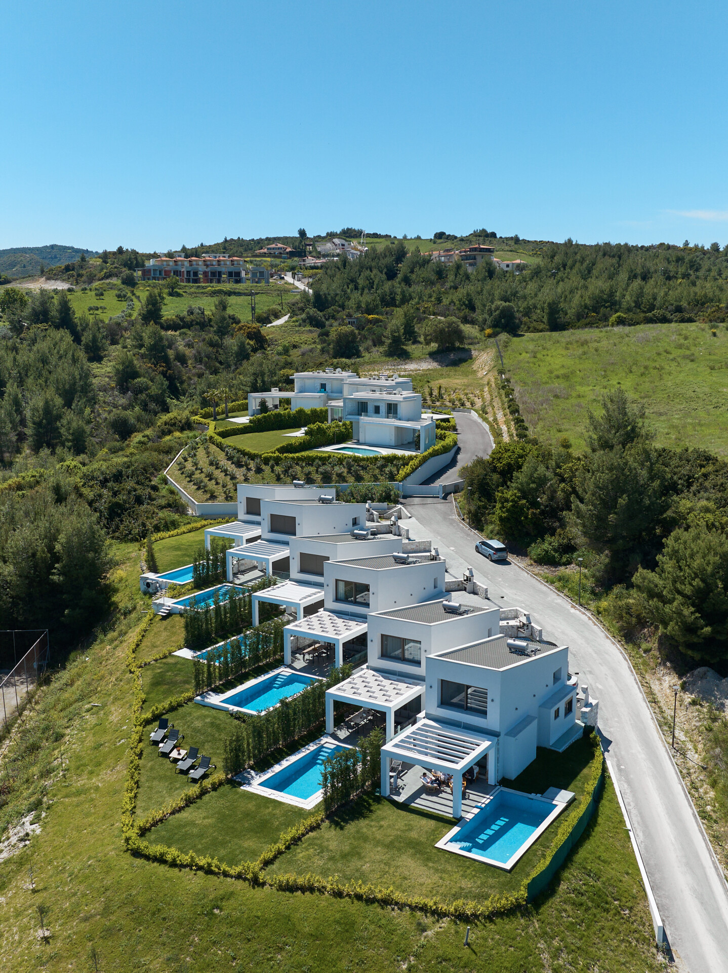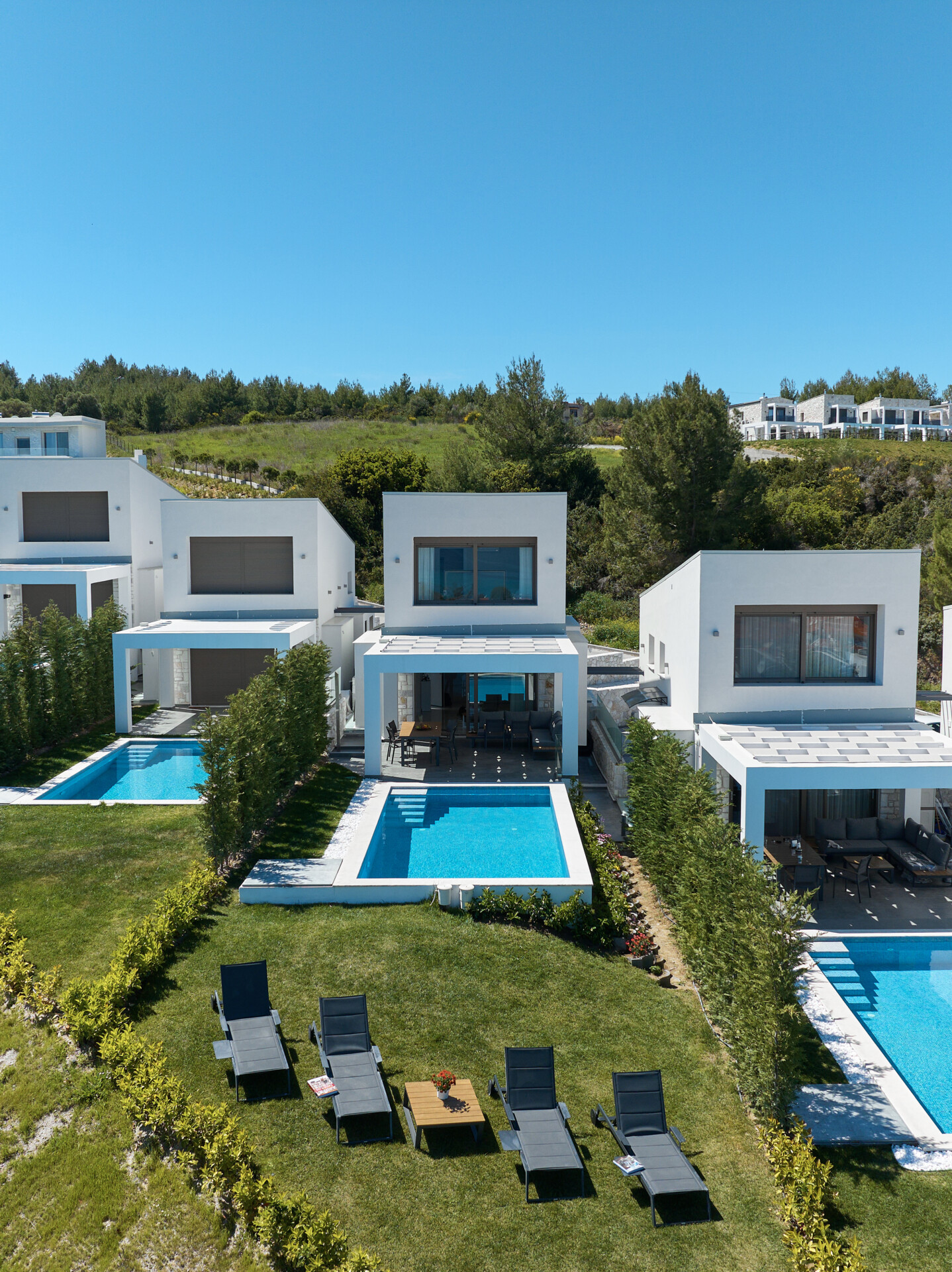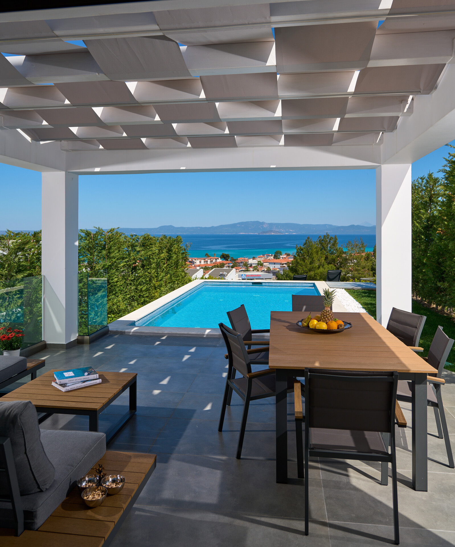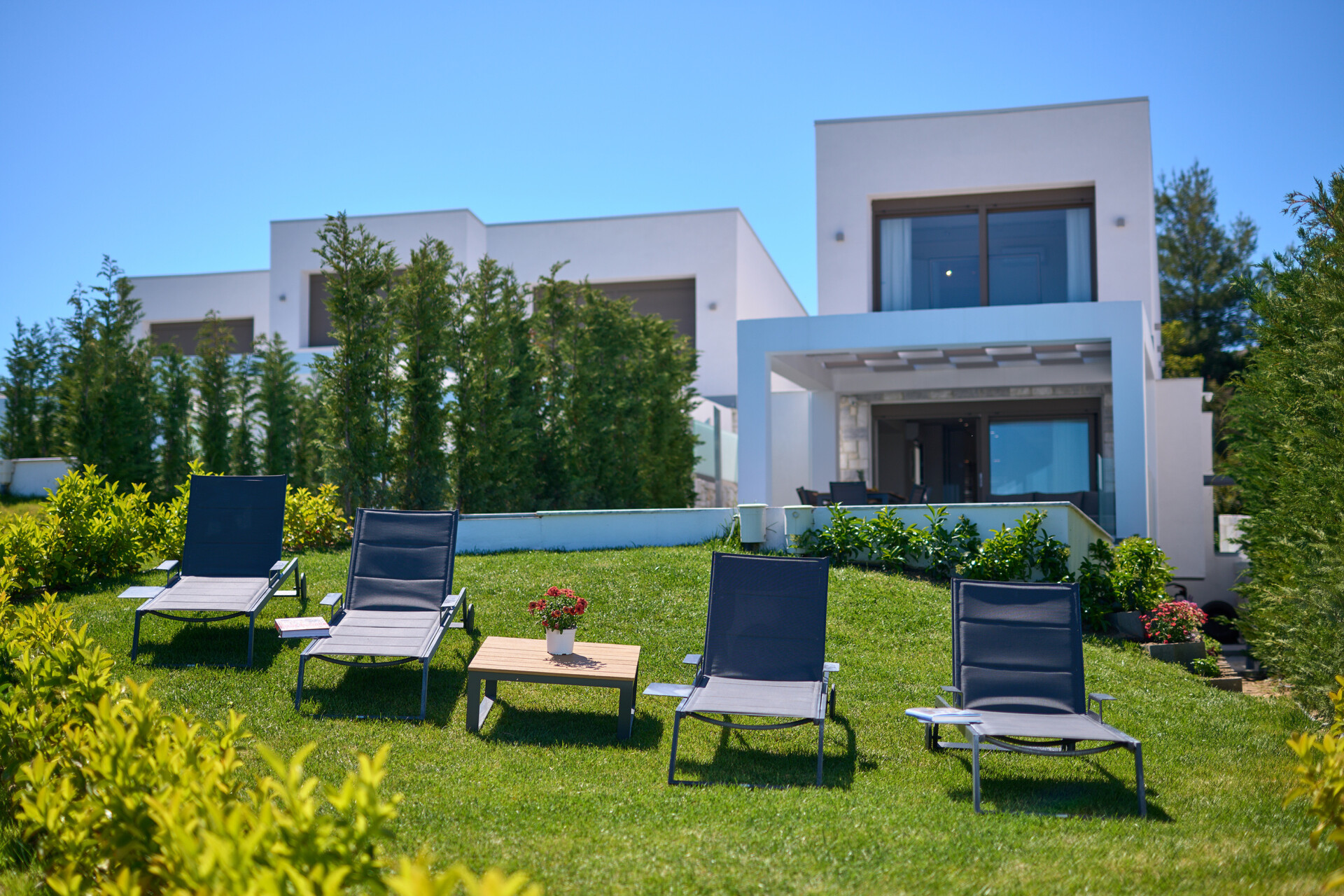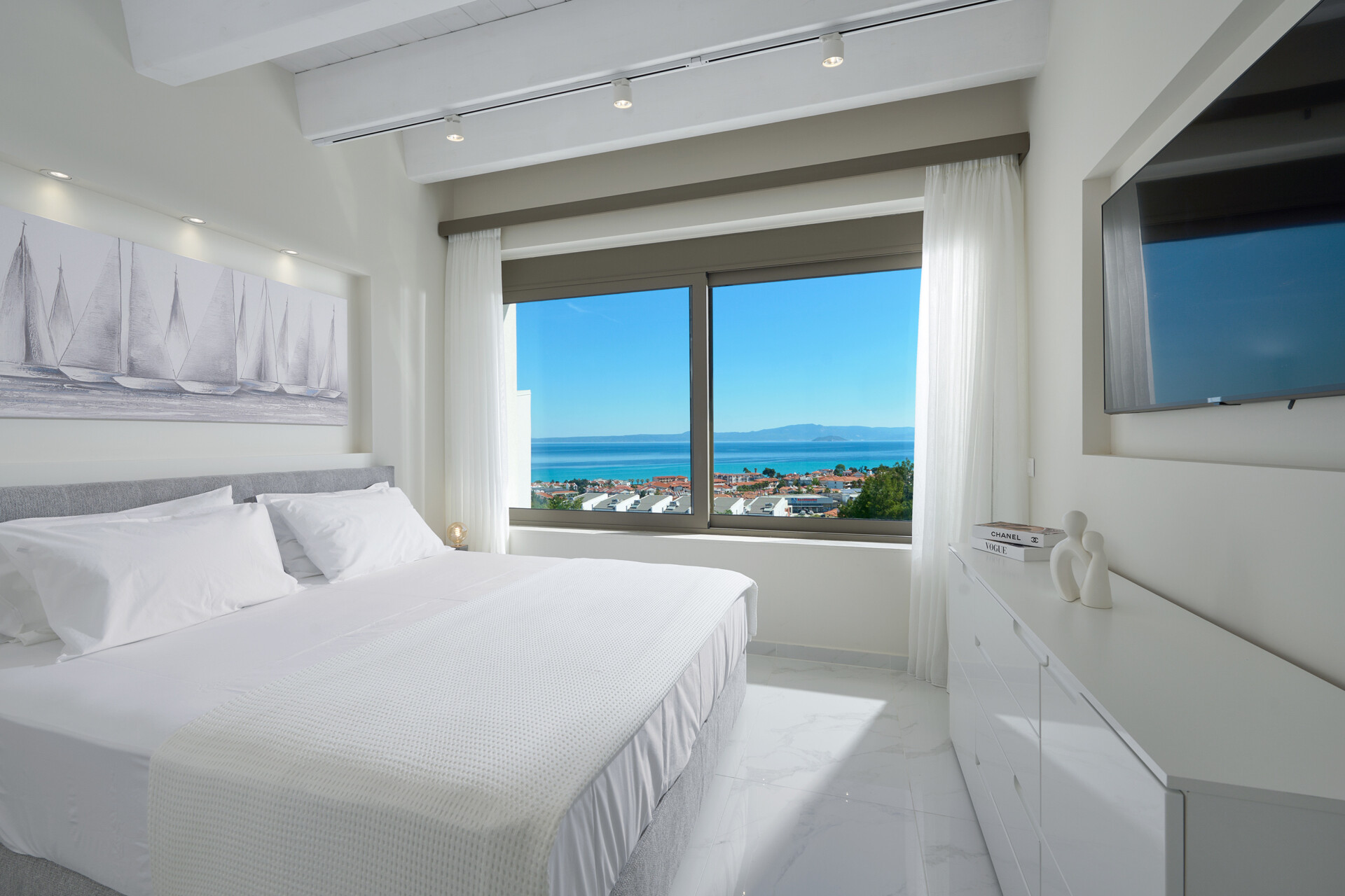 New Luxury Villa in Hanioti with magnificent sea view, private pool, terrace and private parking with EV charger. Is fully premium furnished and equipped. Located in a quiet and green place in 500 meters from the beach, 400 meters from the center of Hanioti, 300 meters from restaurants and bars, 200 meters from a large supermarket.